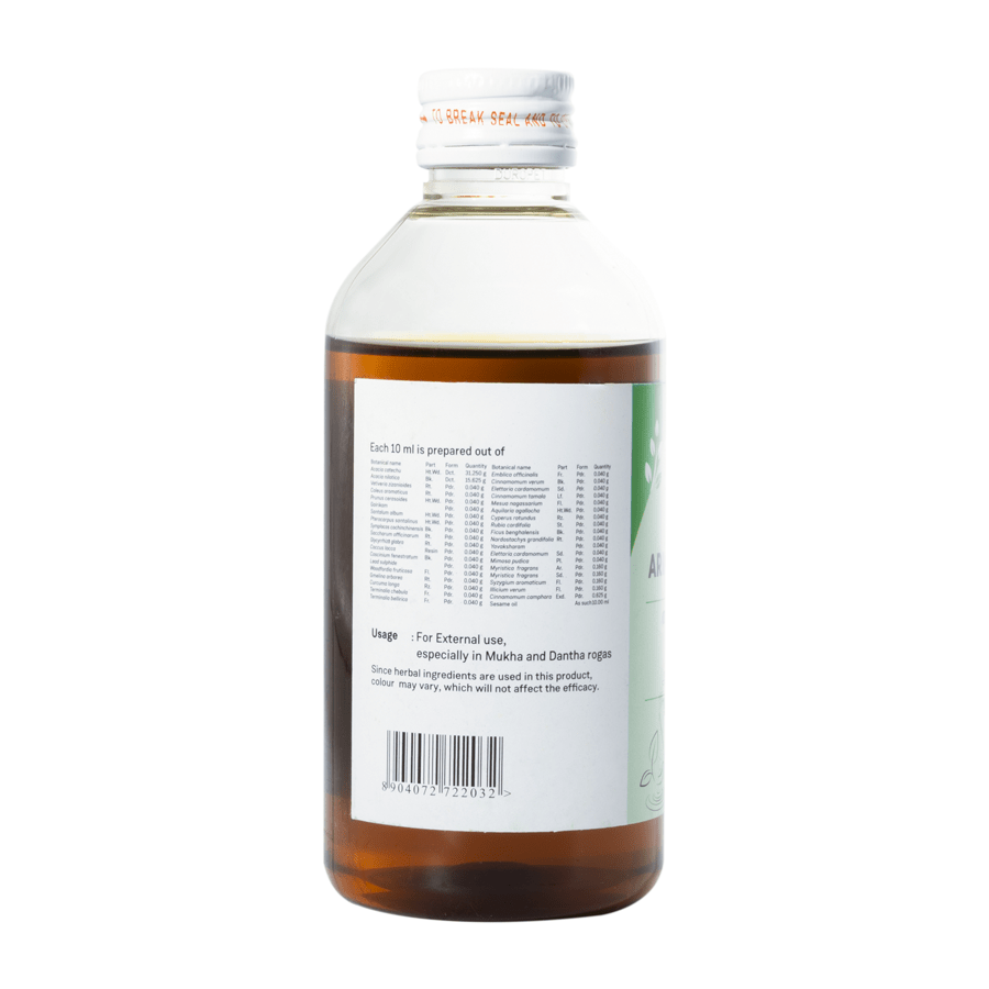 Triphala is chosen for its deeply nourishing properties. The drugs are known to balance the tridoshas effectively. Pacification of Vata stabilises loose and shaky teeth. Alleviation of Pitta heals bleeding gums, prevents gingivitis and foul mouth odour. Kapha, in its balanced state, strengthens and brightens teeth, prevents enamel loss and decay.