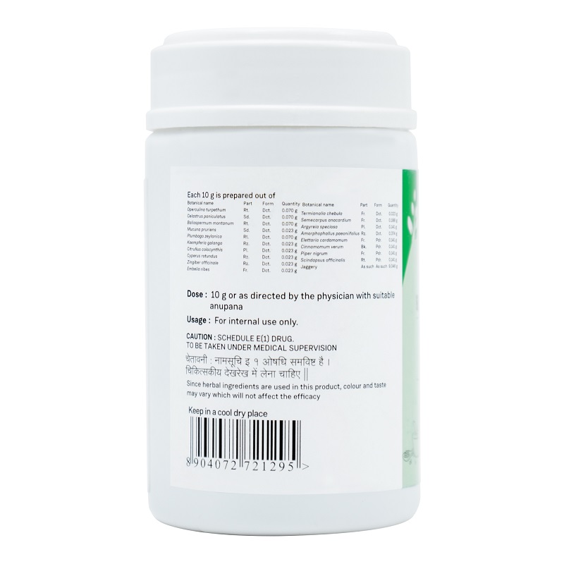 – Other ingredients – Chitraka (Plumbago zeylanica, Tejohva (Zanthoxylum armatum), Danti (Baliospermum montanum), Shati (Hedychium spicatum), Gavakshi/Indravaruni (Citrullus colocynthis), Musta (Cyperus rotundus), Arushkara/Bhallataka (purified Semecarpus Anacardium), Vriddhadaru (Argyrea speciosa) , Surana (Amorphophallus campanulatus).