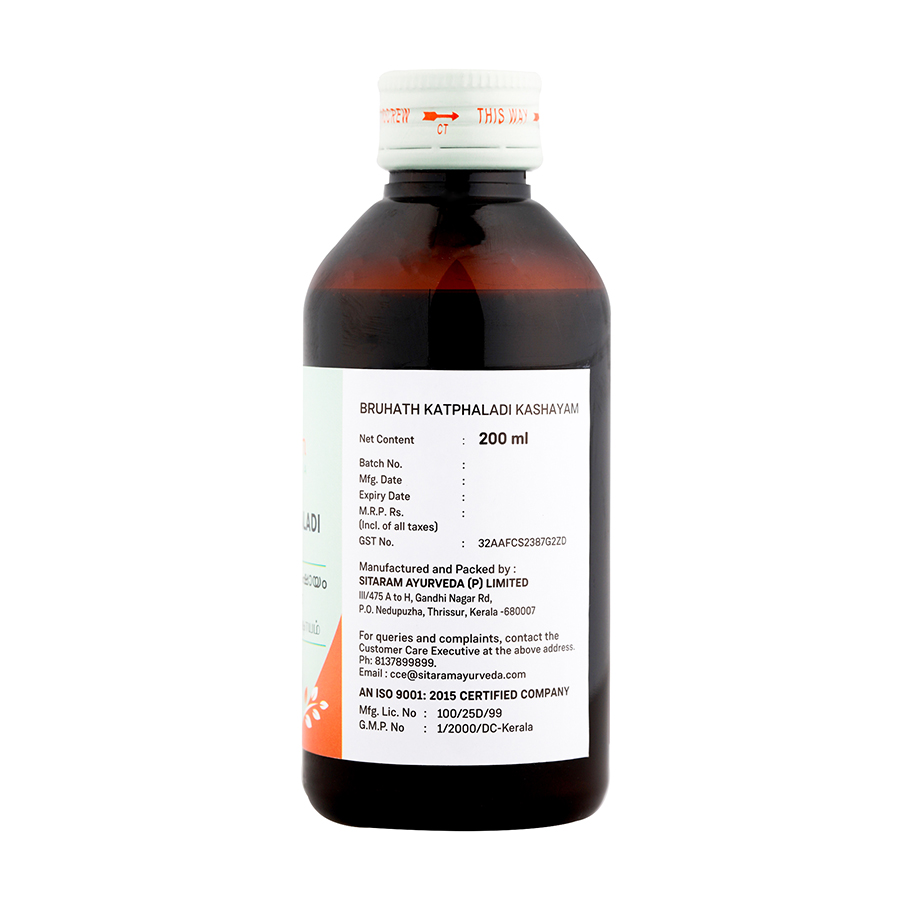 Bruhath Katpahaldi Kashayam is useful in headache, sinusitis, cough and sore throat; hoarseness of voice; recurrent upper respiratory tract disease and inflammation of the tonsils. Helps in managing cervical adenitis. Improves functioning of the thyroid gland, effective in managing obesity and associated lethargy.
