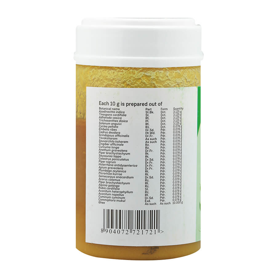 Guggulutiktaka Ghritam is a potent herbal ghee that reaches deep into body tissue and roots out pain, swelling and metabolic waste. The natural steroid Guggulusterone aids in bringing about sustained pain relief and healing.