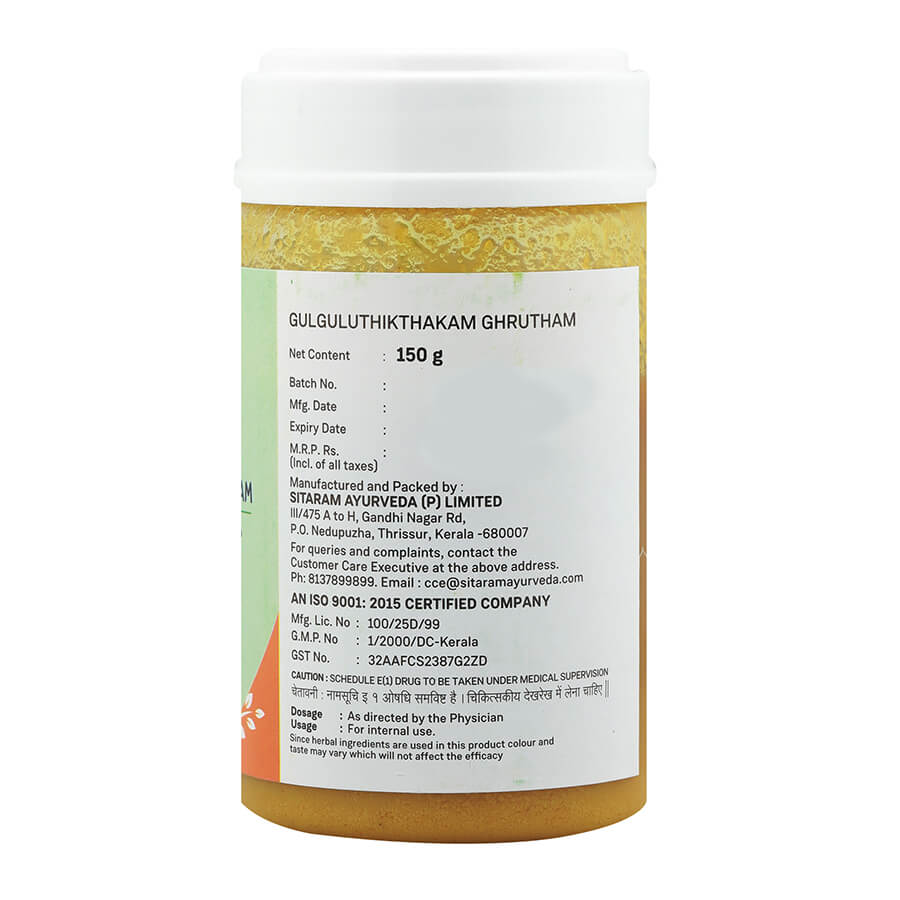Adult: 10-15 ml Guggulutiktaka Ghritam, early morning on empty stomach, or at bedtime, followed by half a glass of lukewarm water, as recommended by the Physician.