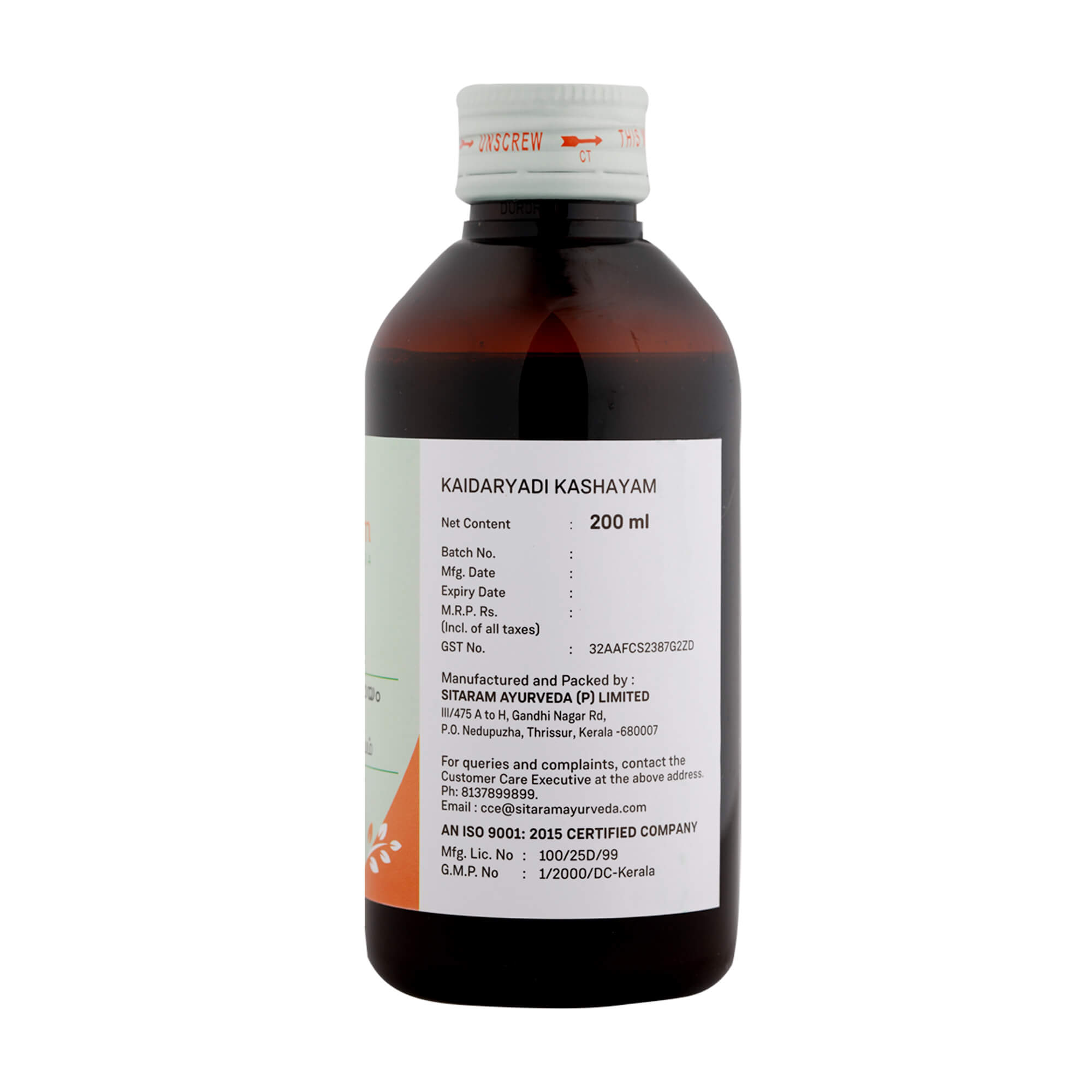 - Kaidaryadi Kashayam is an aqueous extract of Kaidarya (Murraya koenigi), Hareethaki (Terminalia chebula), Shunti (Zingiber officinale) and Patola (Tricosanthes dioica).