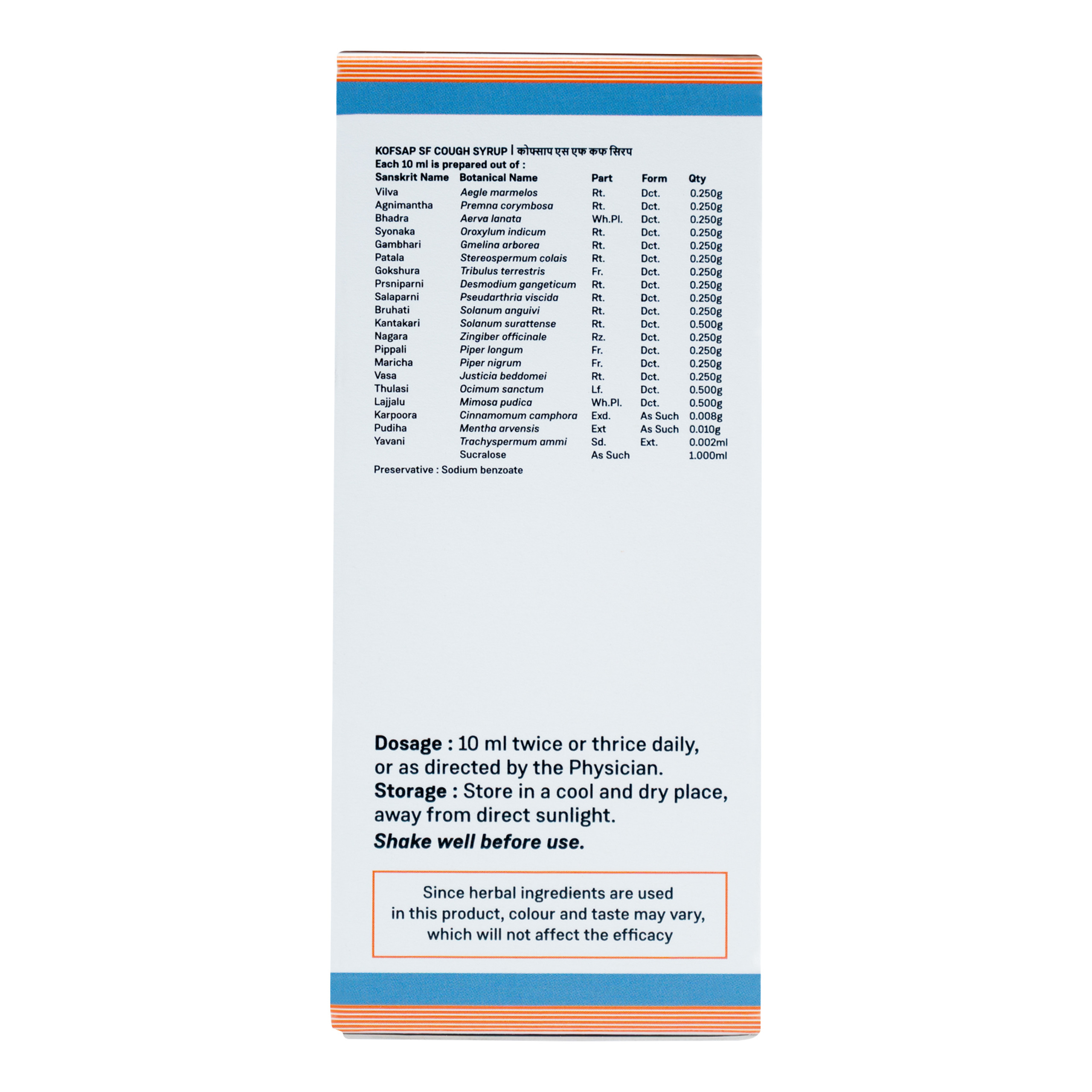 Sitaram Ayurveda presents Kofsap S F Cough Syrup, an Ayurvedic formulation designed to alleviate cough, sore throat, and related respiratory issues. This sugar-free syrup is ideal for prolonged use, especially for individuals managing diabetes.