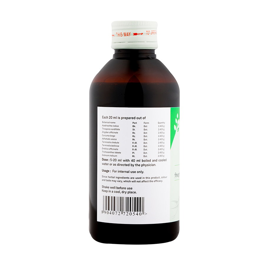 - Deranged Pitta dosha vitiates ‘Rakta’ (blood), heats up the body, interrupts metabolic pathways and causes up the build-up of endotoxins (Ama), which manifests as chronic skin diseases and inflammatory changes in the gut. The Nimbadi Kashayam combination pacifies the excess heat and acidity caused by this deranged Pitta in the gut and bowel. Relieves sour belching, acid eructation, and indigestion.