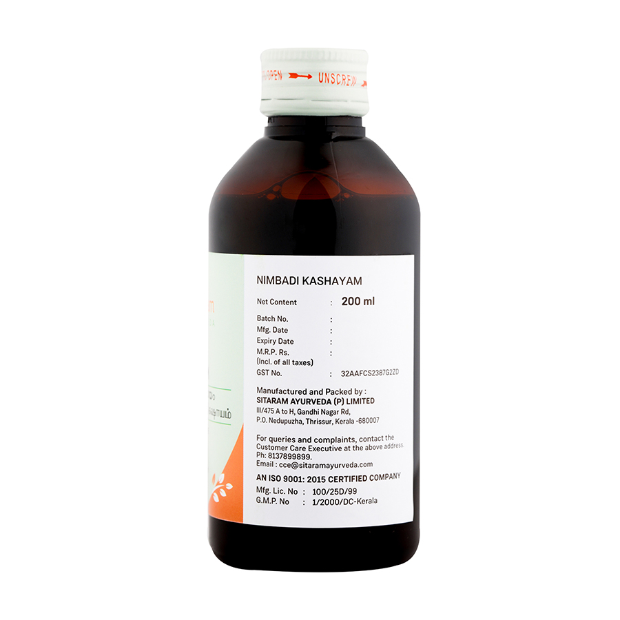 - Nimbadi Kashayam is a balancing blend of ‘Tikta Rasa’ (bitter taste) and Seeta Verya (cooling nature) drugs that pacify deranged ‘Pitta dosha’ in the system.