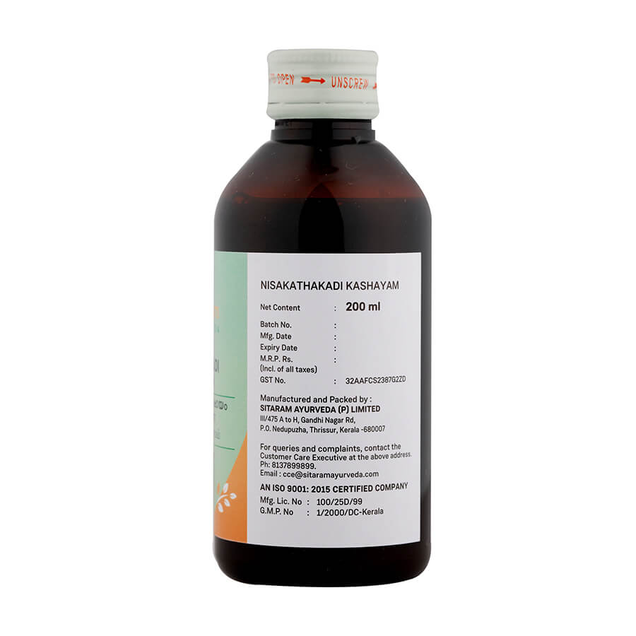 - Nisakathakadi Kashayam is a cooling and invigorating combination of Haridra, Amla, Kataka, Paranti, Lodhra, Bhadra, Kiratatikta, and Useera.