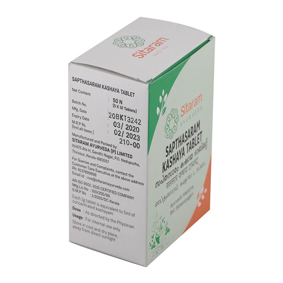Adult: 2-3 Tablets of Saptasaram Kashayam twice daily on empty stomach. Consume dissolved in half a glass of lukewarm water for best results.