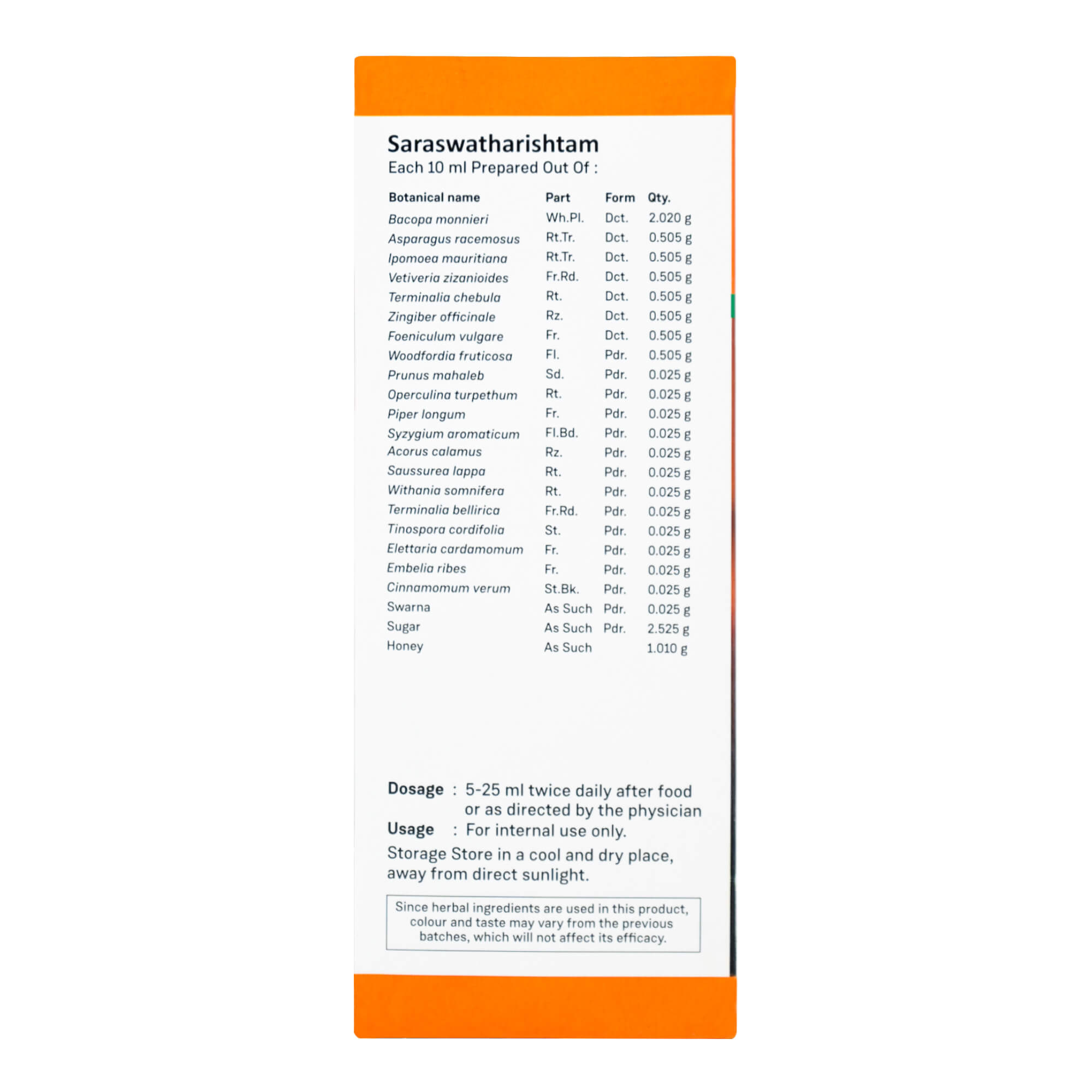 Saraswatharishtam helps to improve memory and cognitive functions, modulates brain activity and maintains the health and functionality of neurotransmitters and brain tissue. The Brahmi and Ashwagandha ingredients in Saraswatharishtam improves your intellect, attention span and ability to focus which helps to enhance your learning ability.
