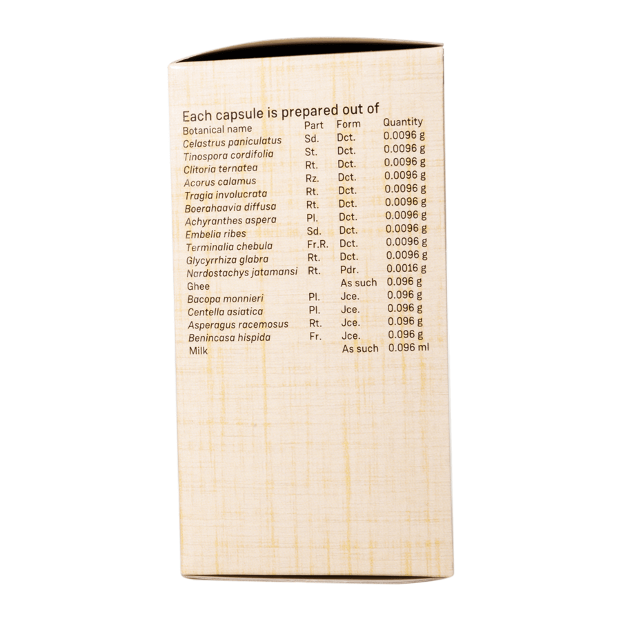 • Stimulint is a combination of Jyotishmati (Celestrus panniculatus), Brahmi (Bacopa monneiri), Aparajitha (Clitoria ternata), Vacha (Acorus calamus), Jatamansi (Nardostachys jatamansi), Amrit (Tinosposra cordifoila), Punarnava (Boerrhavia diffusa), Shatavari (Asparagus racemosus) etc. in a nourishing base of milk and ghee.