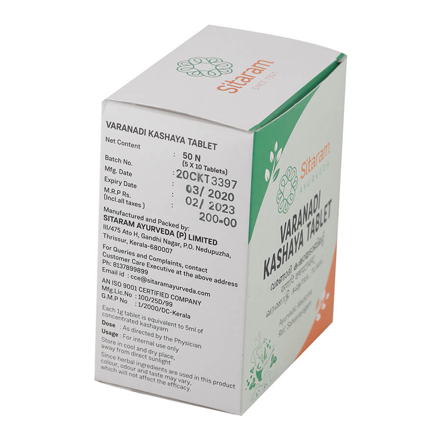• Varanadi Kashayam tablet is heating in nature, the formula balances Vata and Kapha elements in the body.